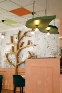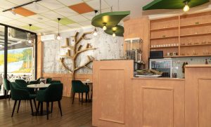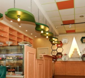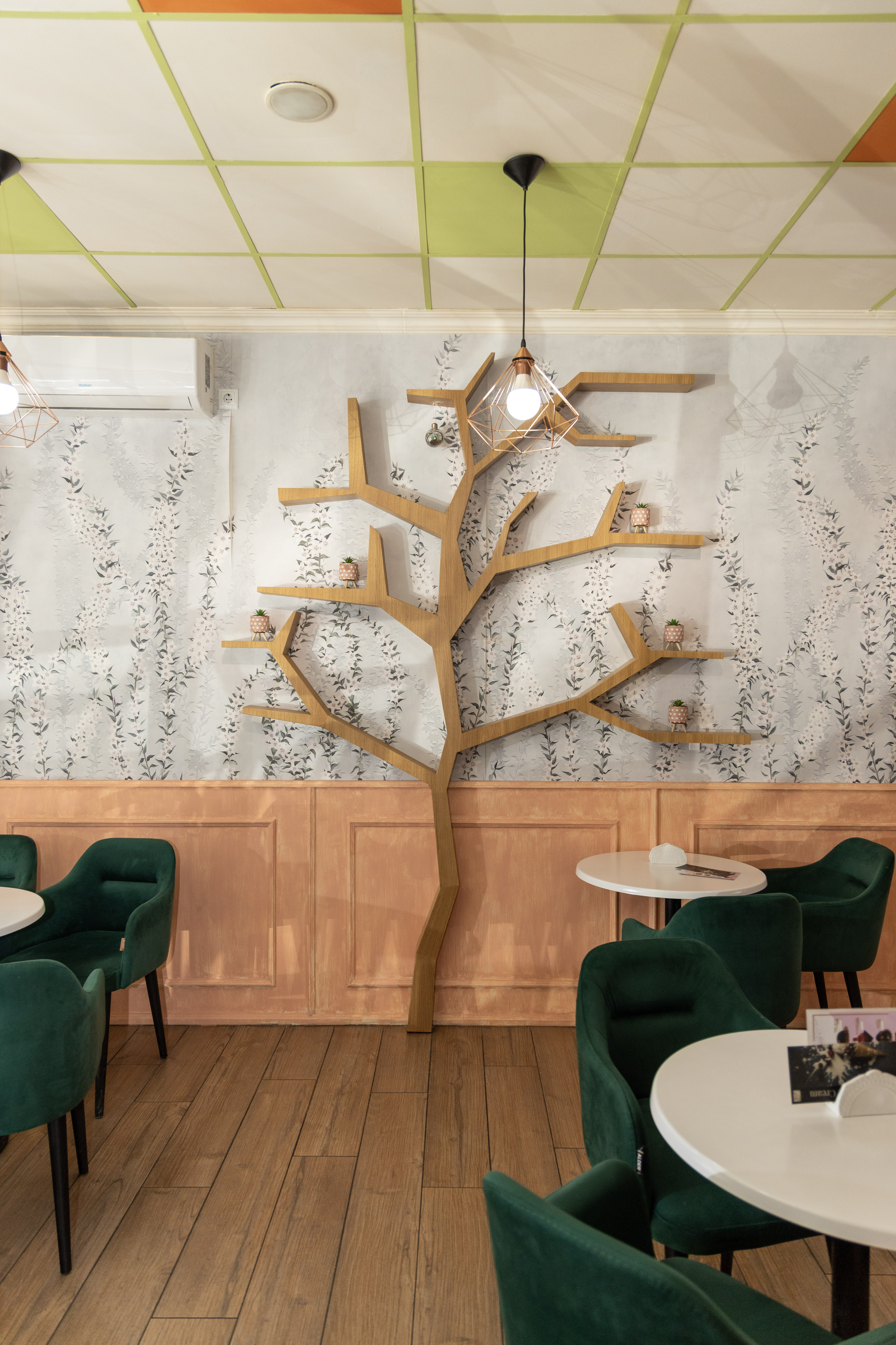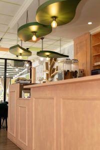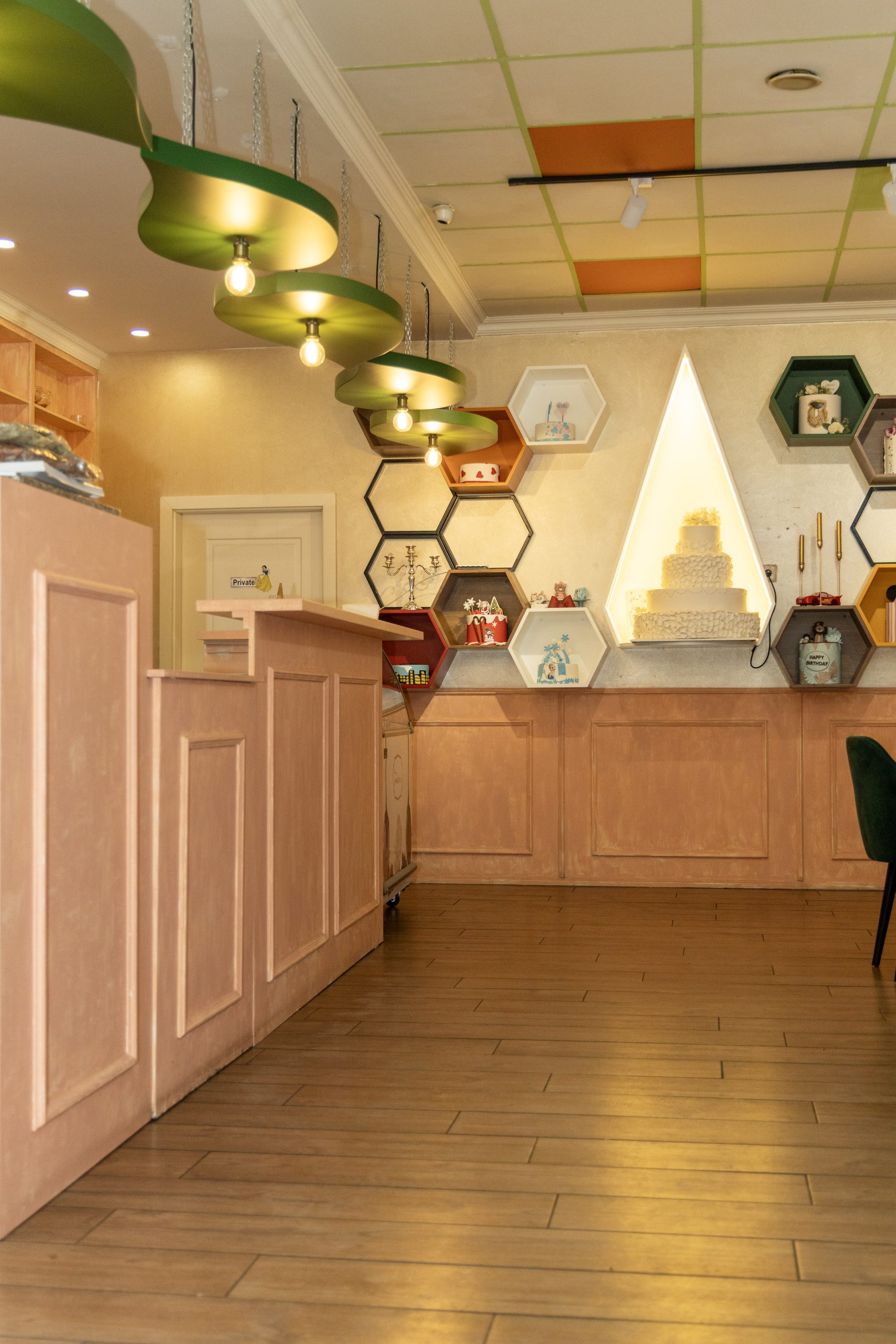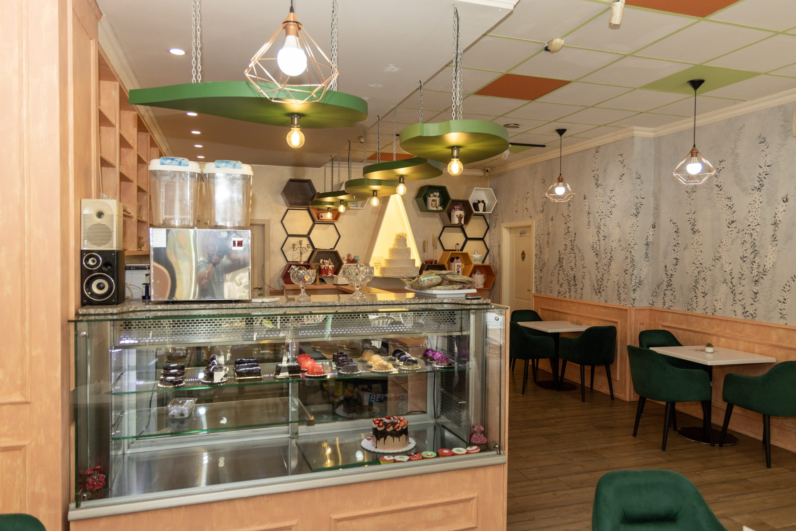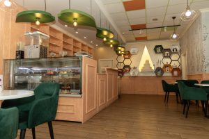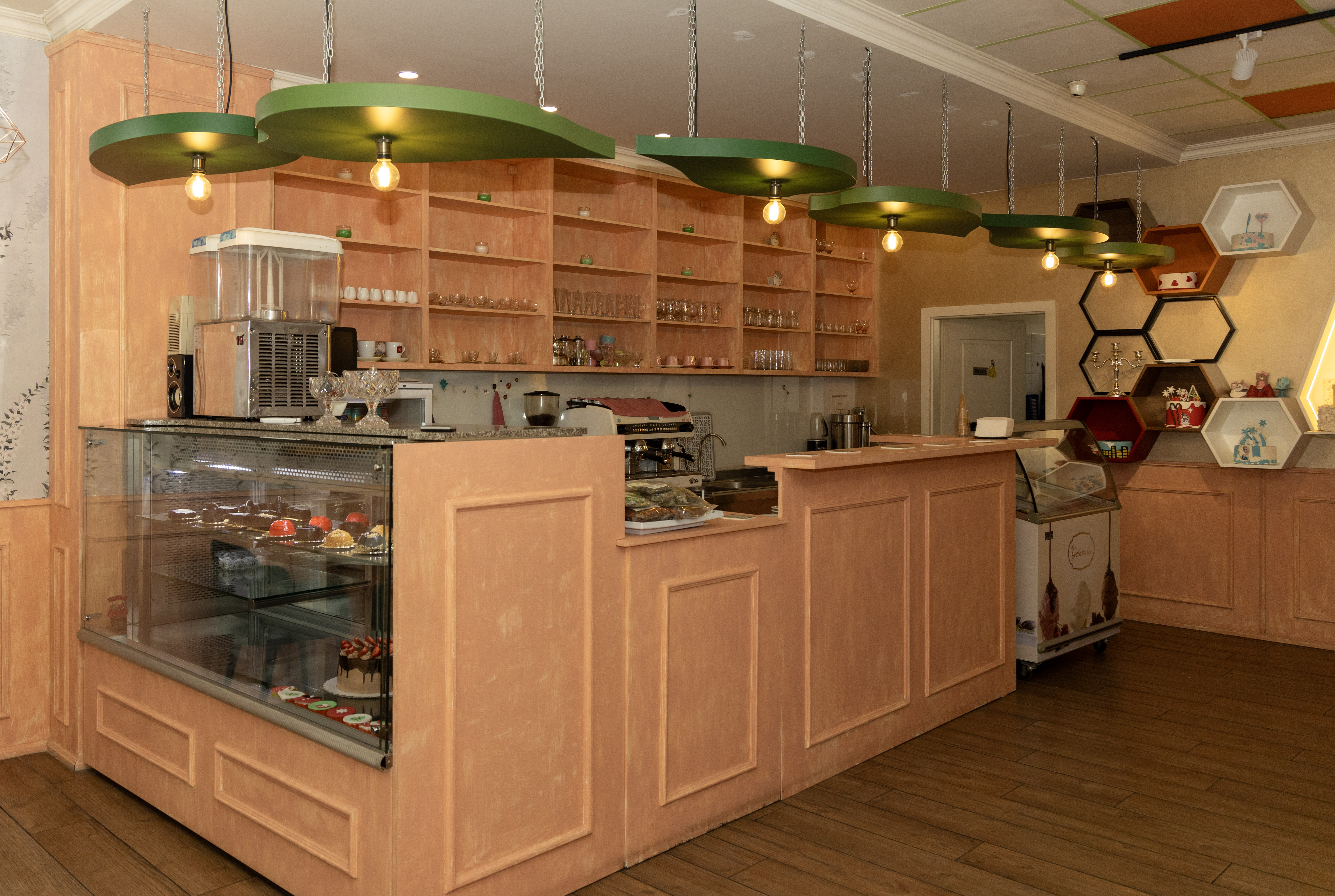 A cozy café bathed in warm amber light, where every corner hums with gentle charm. Honey‑gold accents swirl through the space like the delicate flight of a bee, dancing across wooden tables and soft ceramic cups. The air carries a sweet hint of wildflower honey, blending with the rich aroma of freshly brewed coffee. With whimsical bee‑inspired patterns adorning the walls, the café feels like a small, sunlit hive—inviting, vibrant, and buzzing softly with creative energy.